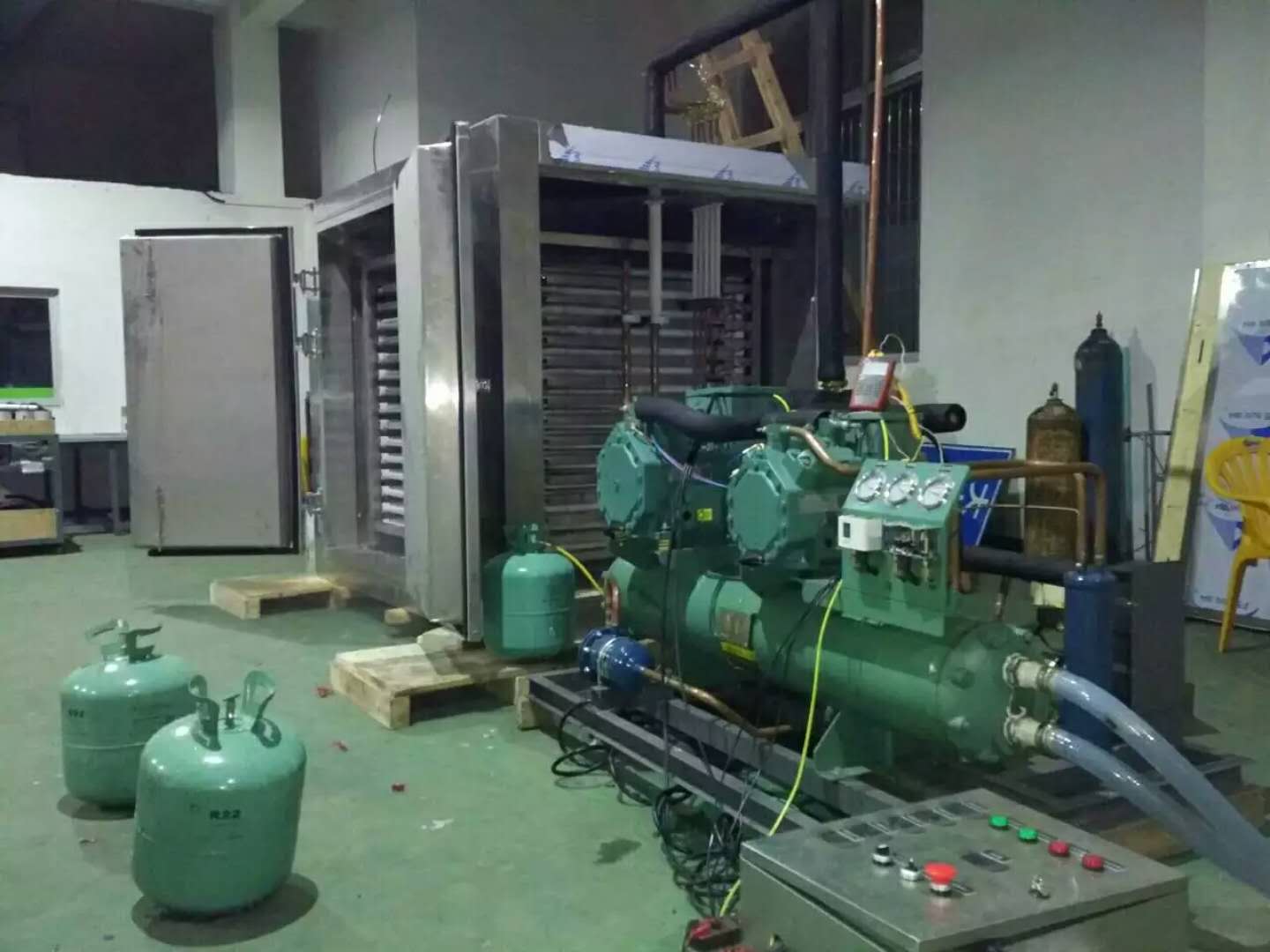 冷庫工程名稱: 一體化速凍冷庫 冷庫設計要求: 速凍量:1000KG/8小時;速凍溫度:-35度至-40度 機組品牌及匹數(shù): 北京比澤爾、30HP 庫內(nèi)蒸發(fā)器: 擱架式速凍鋁平板 應用范圍: 海鮮加工,食品廠速凍等行業(yè)